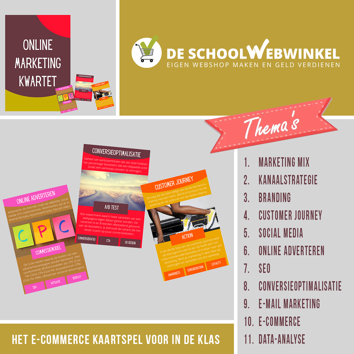 Inhoudelijk worden 11 thema's behandeld met elk vier onderwerpen. De Schoolwebwinkel ziet de samenwerking met Carina van Selling, de founder van het spel, als een waardevolle aanvulling van ons inhoudelijke pakket voor online marketing. Meer info en uiteraard te koop in onze webshop.